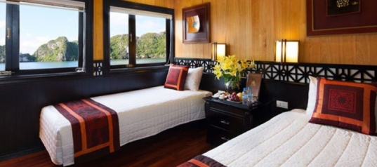 8h50: 9h50: Breakfast will be served at Le Marin Restaurant while the cruise passes by Thien Cung and Dau Go Cave and the Fighting Cock Islet.